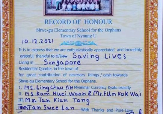 In August 2021, "Saving Lives" began to carry out more fundraising activities actively. The ‘SBS’, an organisation also based in Singapore, heard about our cause and responded positively to our donation drive, helping to raise sufficient funds to purchase 206 packs of rice in a short period of time. "Saving Lives" then donated it to the Thabarwa Nature Centre (Thanlyin Myanmar).