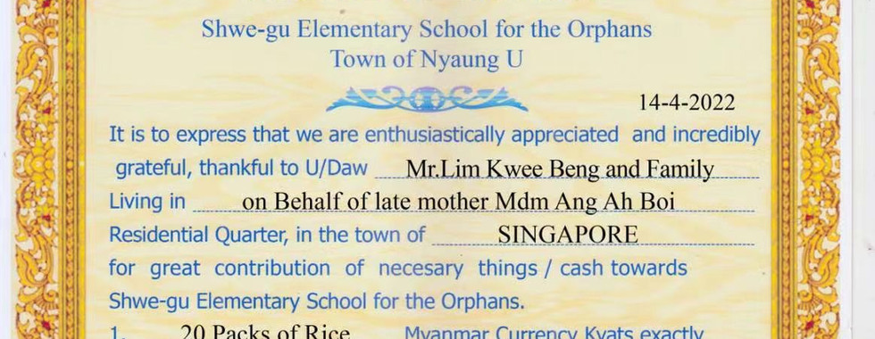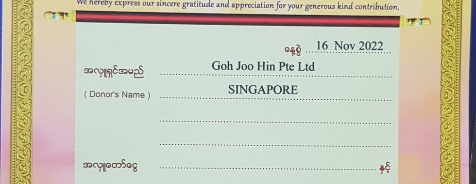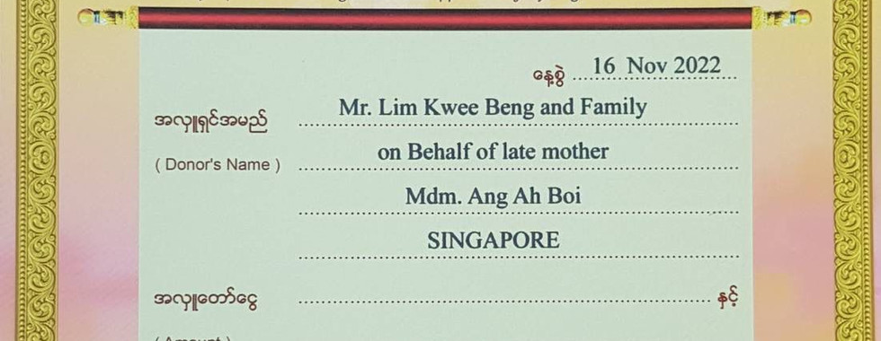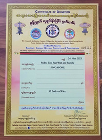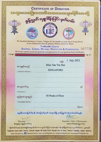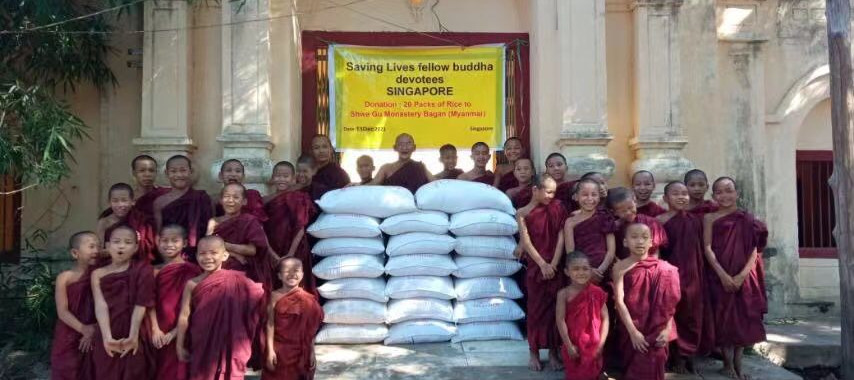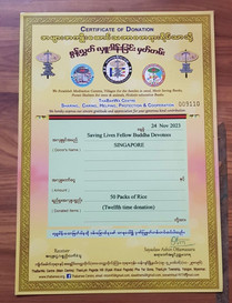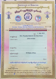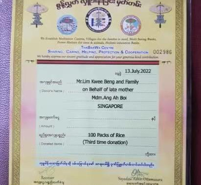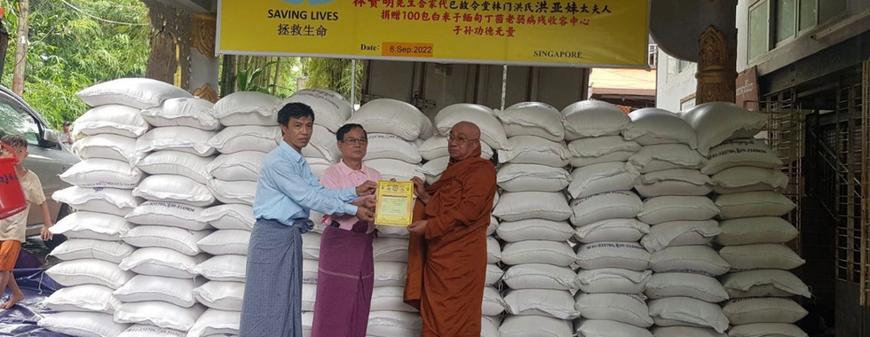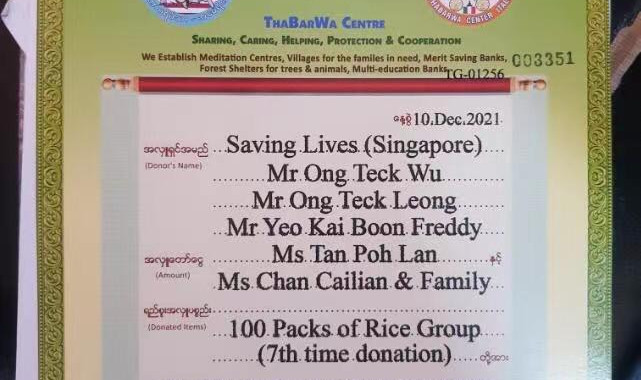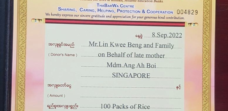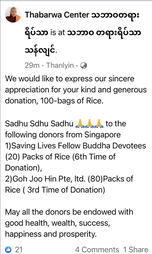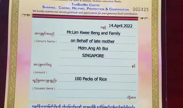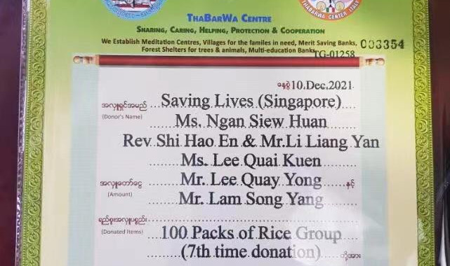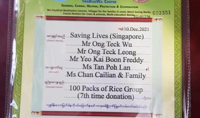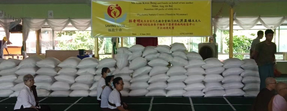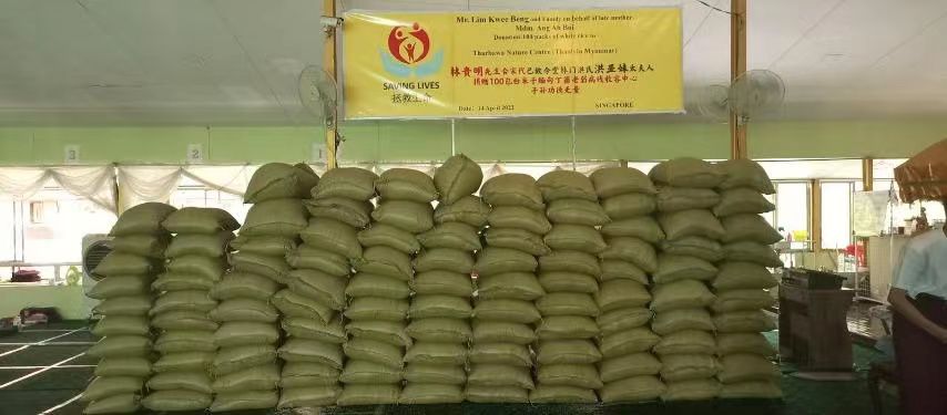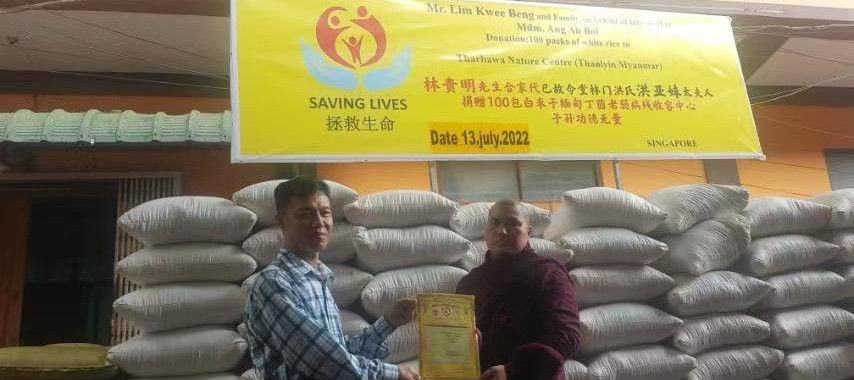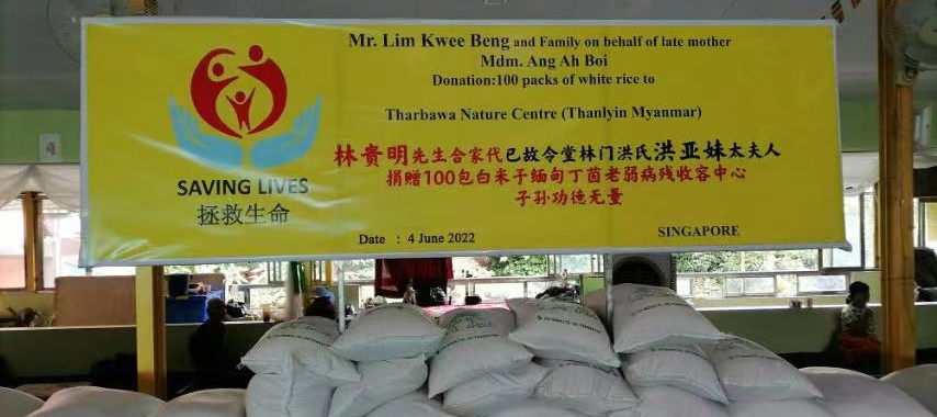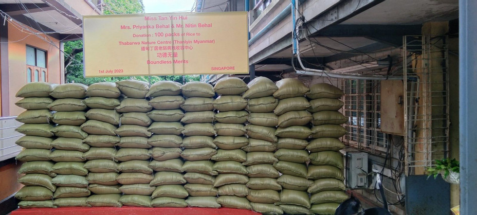 In June 2021, several generous donors from Singapore, namely Mr. Lew Ban Poh, Mr. Goh Chun Hean, Mdm Tan Hiam, Mdm Foo Peck Wah and Ms Samantha Chiew Soh Hong donated a total of 50 packs of rice to the Thabarwa Nature Centre (Thanlyin Myanmar).