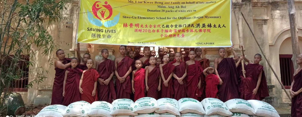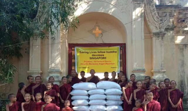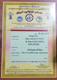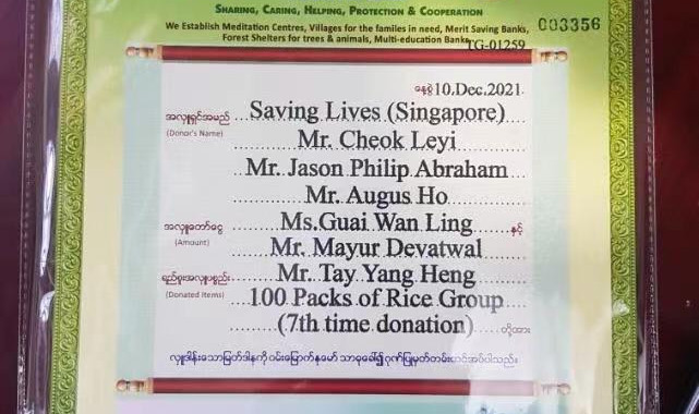 In April 2021, the coup in Myanmar worsened the situation of the pandemic. The members from "Saving Lives" donated 10 packs of rice to the No. 4 Panitar Yone Monastery in Myanmar.